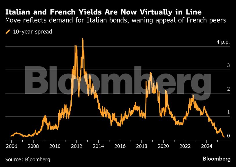 Ως αποτέλεσμα, η διαφορά στο κόστος δανεισμού μεταξύ Γαλλίας και Ιταλίας έχει μειωθεί: οι επενδυτές απαιτούν μόλις 12 μονάδες βάσης επιπλέον απόδοση για να δανείσουν στην Ιταλία για 10 χρόνια αντί για τη Γαλλία — το μικρότερο ποσό των τελευταίων δύο δεκαετιών.