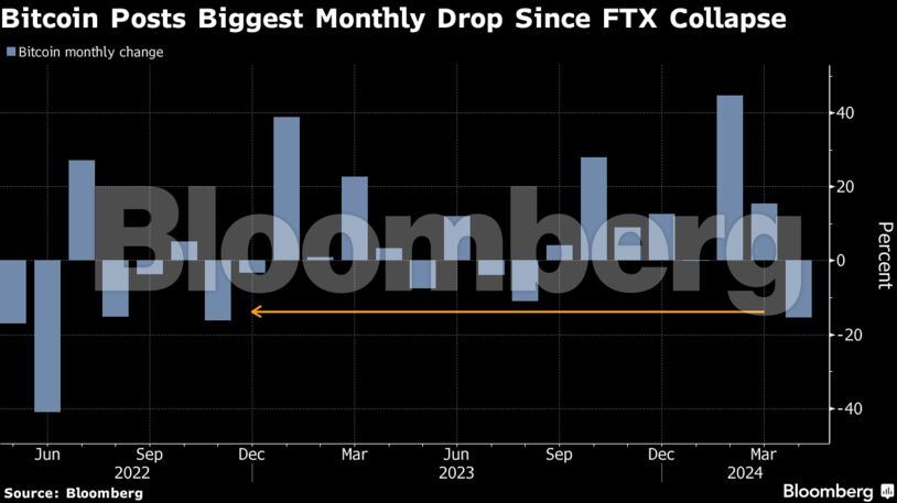 Το μεγαλύτερο ψηφιακό περιουσιακό στοιχείο κατέγραψε απώλειες σχεδόν 16% τον Απρίλιο, καθώς η μανία για τα αμερικανικά spot bitcoin ETFs ισοπεδώθηκε, αφού προηγουμένως είχε ανεβάσει το token στο υψηλό ρεκόρ των σχεδόν 74.000 δολαρίων τον Μάρτιο.