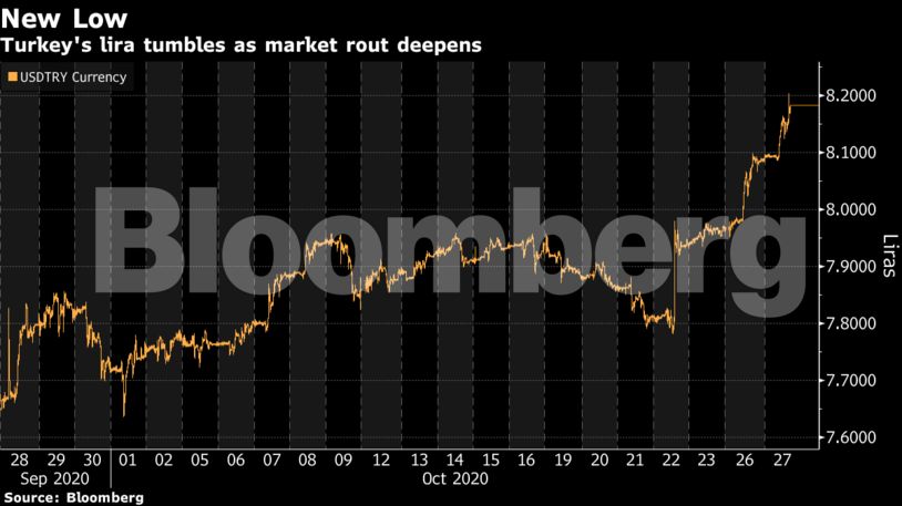 Η λίρα Τουρκίας καταρρέει καθώς η ρουτίνα της αγοράς βαθαίνει – με την ισοτιμία της με το δολάριο να εκτοξεύεται σήμερα πάνω από τις 8,2 λίρες για ένα αμερικανικό νόμισμα