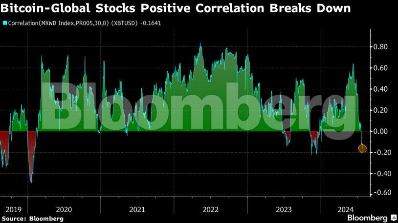 Ο συντελεστής συσχέτισης 30 ημερών για το bitcoin και τον δείκτη παγκόσμιων μετοχών της MSCI καταγράφει πτώση προς το μείον 0,20, κάτι το οποίο αποτελεί ένα σπάνιο φαινόμενο, καθώς το μέτρο έχει συνήθως κρατήσει θετικό πρόσημο από το 2020, όπως δείχνουν τα στοιχεία που συγκέντρωσε το Bloomberg.