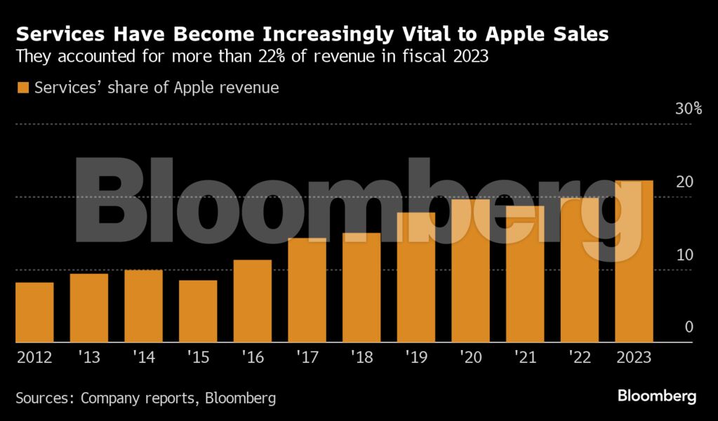 Οι υπηρεσίες αποτέλεσαν γενικά μοχλό ανάπτυξης για την Apple τα τελευταία χρόνια. Αντιπροσώπευαν περισσότερο από το 22% των πωλήσεων κατά το πιο πρόσφατο οικονομικό έτος, από λιγότερο από 10% πριν από μια δεκαετία, και η άνοδος αυτή βοήθησε να αμβλυνθεί η κατά καιρούς υποτονική ζήτηση για συσκευές.