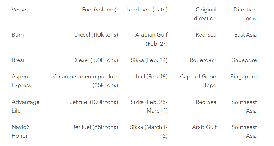 Πέντε δεξαμενόπλοια, φορτωμένα με καύσιμα όπως ντίζελ και καύσιμα αεροσκαφών, τα οποία αρχικά κατευθύνονταν προς τη Δύση, έχουν αλλάξει πορεία τις τελευταίες ημέρες και πλέον κατευθύνονται προς την Ανατολική Ασία, σύμφωνα με δεδομένα παρακολούθησης πλοίων που συγκέντρωσε το Bloomberg. Τρία από τα φορτία προέρχονταν από την Ινδία, ενώ τα άλλα δύο είχαν ήδη αποχωρήσει από τον Περσικό Κόλπο πριν τα Στενά του Ορμούζ κλείσουν ουσιαστικά την περασμένη εβδομάδα.