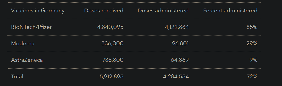 Ο Γερμανός υπουργός Υγείας επικαλούμενος το Paul Ehrlich Institute ανέφερε πως δεν υπάρχει σχεδόν καμία ανεπιθύμητη παρενέργεια στα τρία εγκεκριμένα εμβόλια. Το ινστιτούτο παρακολουθεί τις νέες πληροφορίες και τις συγκρίνει με τα δεδομένα καθημερινά.