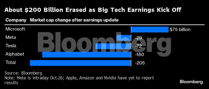 Ορισμένες από τις λεγόμενες και «Yπέροχες Επτά» εταιρείες τεχνολογίας οι οποίες τροφοδότησαν το φετινό ράλι των αμερικανικών μετοχών ανακοίνωσαν απογοητευτικά εταιρικά κέρδη, με αποτέλεσμα να χάσουν περίπου $200 δισ. από την αξία κεφαλαιοποίησής τους και επιπλέον να οδηγήσουν τον S&P 500 σε απώλειες.