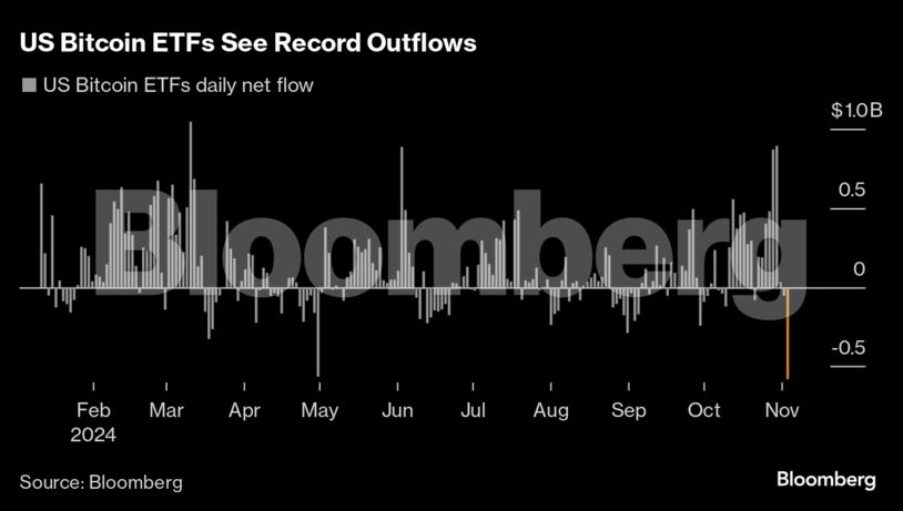 Οι επενδυτές σε ETFs του bitcoin αφαίρεσαν θέσεις μια ημέρα πριν από τις εκλογές, με τα 12 μεγάλα κεφάλαια να σημειώνουν ρεκόρ εκροών ύψους 579,5 εκατ. δολαρίων τη Δευτέρα, σύμφωνα με στοιχεία που συγκέντρωσε το Bloomberg.