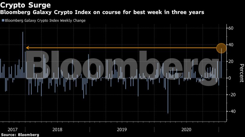 Ο δείκτης Bloomberg Galaxy Crypto Index, που περιλαμβάνει Bitcoin, Ether και τρία άλλα ψηφιακά νομίσματα, σημείωσε άνοδο περίπου 50% αυτήν την εβδομάδα, τη μεγαλύτερη που έχει καταγράψει, από τον Δεκέμβριο του 2017. Πιο συγκεκριμένα, το Bitcoin κατέρριψε το φράγμα των 41.092 δολαρίων, επίπεδο που αποτελεί νέο ρεκόρ.