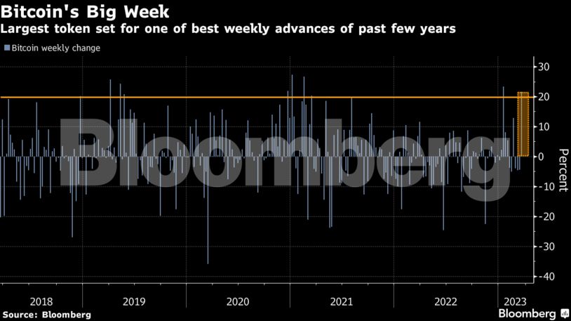 Κερδισμένο βγαίνει το bitcoin από τις εκτιμήσεις των αναλυτών και των αγορών για μείωση των επιτοκίων της Fed. Το μεγαλύτερο κρυπτονόμισμα του κόσμου, δεδομένης και της πρόσφατης τραπεζικής κρίσης, έχει καταγράψει άνοδο της τάξης του 21% από τη Δευτέρα. Σύμφωνα με τα στοιχεία του Bloomberg, το ψηφιακό asset είχε καταγράψει παρόμοια εβδομαδιαία αύξηση μόλις 10 φορές την τελευταία πενταετία. Τα μικρότερα αλλά σημαντικά κρυπτονομίσματα ether και dogecoin έχουν καταγράψει κι αυτά παράλληλη αύξηση.