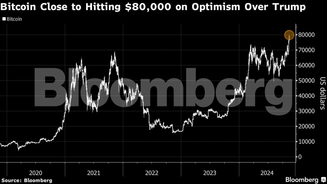 Μια ανάσα πριν τα 80.000 δολάρια βρέθηκε το bitcoin, ωθούμενο από τη νίκη Τραμπ στις αμερικανικές εκλογές και με την προσδοκία ότι ο εκλεγμένος πρόεδρος θα υλοποιήσει τις προεκλογικές εξαγγελίες του για αναπτυξιακά μέτρα και στήριξη των crypto.