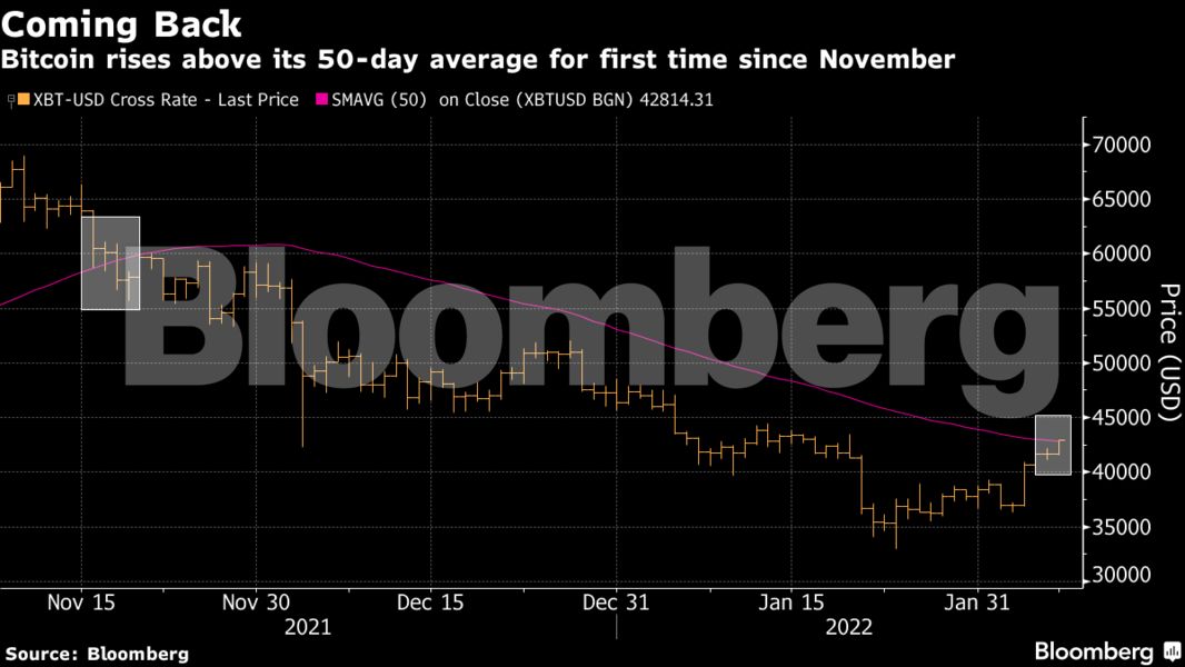 Το Bitcoin ξεπέρασε τον κινητό μέσο όρο των 50 ημερών, για πρώτη φορά μετά από δύο μήνες. Το μεγαλύτερο κρυπτονόμισμα κατέγραψε άνοδο έως και 3% στα 42.956 δολάρια, σε σύγκριση με το τεχνικό ορόσημο των 50 ημερών που βρίσκεται στα 42.810 δολάρια. Η σημερινή κίνηση έρχεται σε συνέχεια της ανόδου της Παρασκευής (4-Φεβρουαρίου) -τη μεγαλύτερη από τον Οκτώβριο – η οποία το επανέφερε πάνω από τα 40.000 δολάρια.