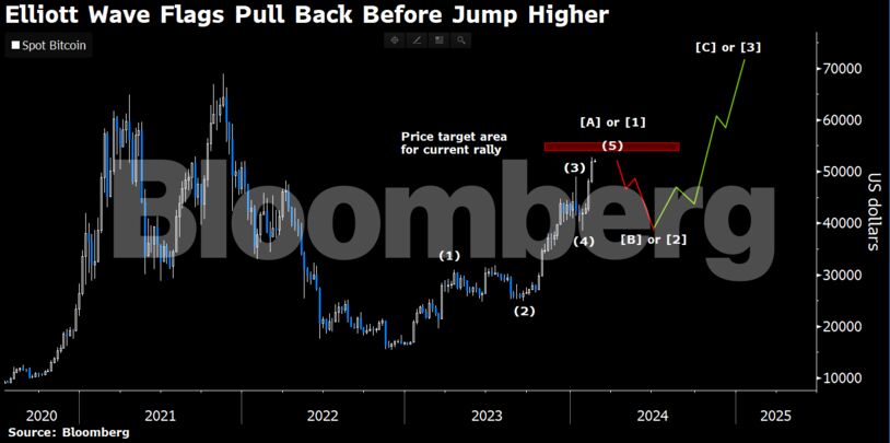 Οι μελέτες Elliott Wave υποστηρίζουν ότι οι αγορές είναι επιρρεπείς σε επαναλαμβανόμενα μοτίβα διακυμάνσεων. Η εφαρμογή της τεχνικής στο bitcoin υποδηλώνει μια υποχώρηση προς το επίπεδο των 40.000 δολαρίων πριν από μια άνοδο προς τα περίπου 70.000 δολάρια. Αυτό συγκρίνεται με το μέγιστο όλων των εποχών στα 68.992 δολάρια τον Νοέμβριο του 2021.
