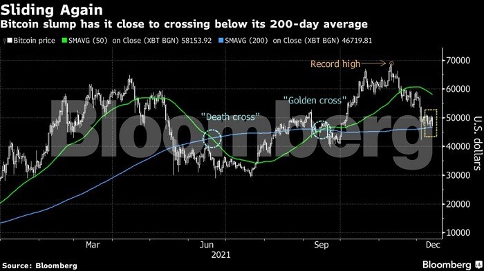 Η πτώση του bitcoin το φέρνει πιο κοντά στη μέση τιμή των τελευταίων 200 ημερών, που αυτή τη στιγμή βρίσκεται στις 46.720 δολάρια.