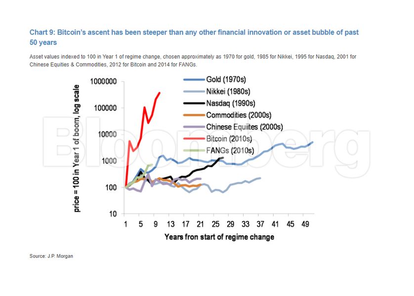Ο John Normand της JPMorgan επανέλαβε σε σημείωμά του την Παρασκευή ότι η άνοδος του Bitcoin ήταν πιο απότομη από οποιαδήποτε άλλη οικονομική καινοτομία ή «φούσκα» των τελευταίων 50 χρόνια.