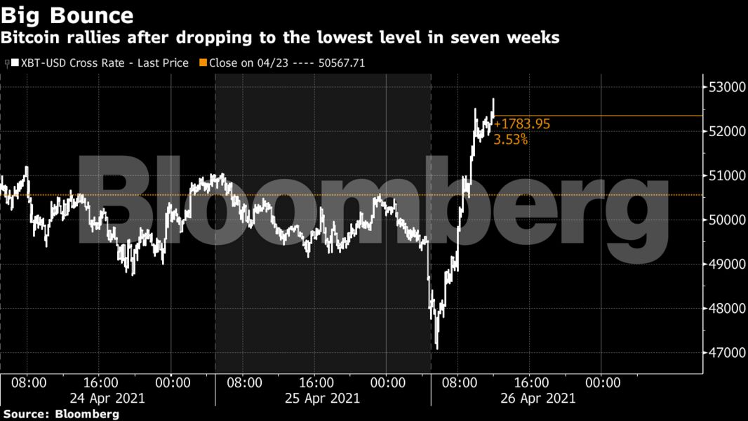 Το ψηφιακό νόμισμα κινήθηκε καθοδικά έπειτα από το ρεκόρ των 64.870 δολαρίων στις 14 Απριλίου, λαμβάνοντας ώθηση από την επιτυχή δημόσια εγγραφή της Coinbase. Για πρώτη φορά από τις αρχές Οκτωβρίου, έπεσε κάτω από τον μέσο όρο των 100 ημερών στα τέλη της περασμένης εβδομάδας, καθώς η JPMorgan προειδοποίησε ότι η ανοδική του δυναμική ενείχε κινδύνους. Η κατάρρευση δύο πλατφορμών ανταλλαγής κρυπτονομισάμτων στην Τουρκία στο τέλος της περασμένης εβδομάδας ενδέχεται επίσης να έχει ενισχύσει τις ανησυχίες περί «φούσκας» στην αγορά.