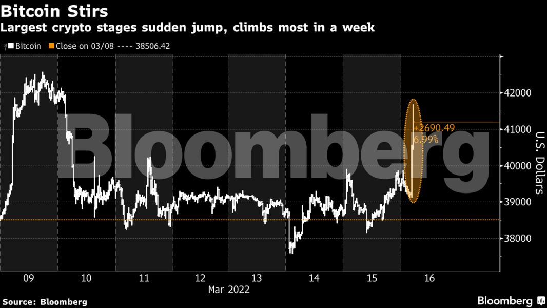 Το Bitcoin εκτινάχθηκε έως και 5,7% στα 41.691 δολάρια πριν εγκαταλείψει όλα του τα κέρδη και διαπραγματευτεί στα 39.540 δολάρια στις 2:55 μ.μ. στο Χονγκ Κονγκ.