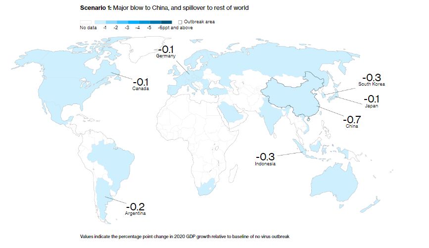 Αυτό είναι το πιο ακραίο από τα τέσσερα σενάρια που ανέπτυξε το Bloomberg, βασιζόμενο στην εμπειρία στην Κίνα, τη διασπορά των κρουσμάτων σε άλλες χώρες, τις εκτιμήσεις των κινδύνων για τις παγκόσμιες αλυσίδες εφοδιασμού και ένα μοντέλο μεγάλης κλίμακας της παγκόσμιας οικονομίας.