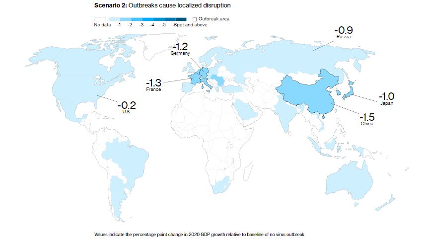 Εφόσον συμβεί αυτό, θα ακολουθήσει ανάκαμψη στο δεύτερο εξάμηνο μετά το σοβαρό σοκ του πρώτου. Σε παγκόσμιο επίπεδο και για τις μεγάλες οικονομίες όπως οι ΗΠΑ, ο αντίκτυπος θα είναι περιορισμένος στα ετήσια στοιχεία του ΑΕΠ.