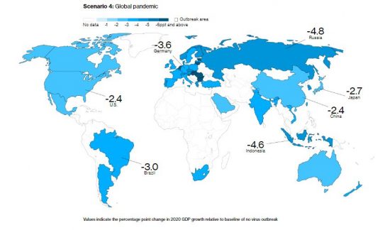 Η εξάπλωση της επιδημίας θα μπορούσε να προκαλέσει οικονομική επιβράδυνση στις ΗΠΑ, την Ευρωζώνη και την Ιαπωνία, την χαμηλότερη ανάπτυξη ιστορικά στην Κίνα και τη συνολική απώλεια 2,7 τρισ. δολαρίων από το ακαθάριστο προϊόν του πλανήτη, ποσό που ισοδυναμεί με το συνολικό ΑΕΠ του Ηνωμένου Βασιλείου.