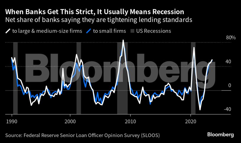 Σύμφωνα, παράλληλα, με τα επίσημα στοιχεία των senior loan officers τραπεζικών ιδρυμάτων (SLOOS), οι τράπεζες έχουν θέσει τα αυστηρότερα κριτήρια δανεισμού από το 2008, εξαιρουμένης της πανδημίας, κάτι το οποίο θα γίνει ιδιαίτερα αισθητό το δ’ τρίμηνο του έτους.