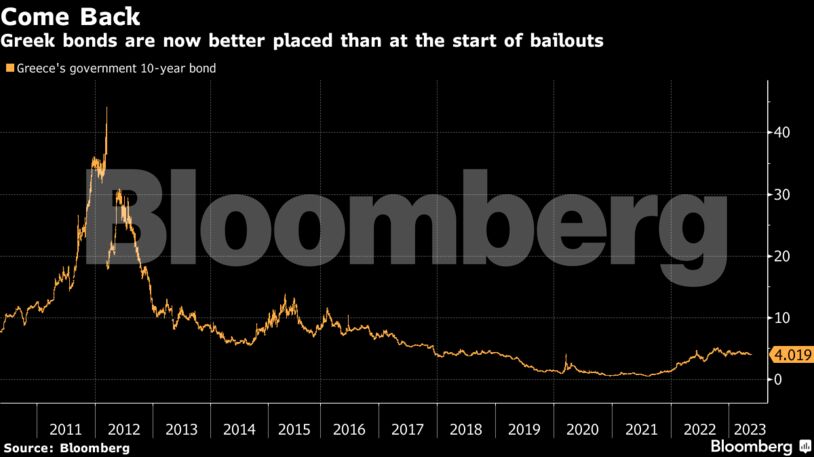 Το ασφάλιστρο κινδύνου για τα ελληνικά κρατικά ομόλογα σε σύγκριση με τα γερμανικά έχει μειωθεί κατά περίπου το ένα τρίτο τον τελευταίο χρόνο. Διαπραγματεύονται με απόδοση παρόμοια με αυτή των ιταλικών ομολόγων. Η ανάκαμψη της οικονομίας έχει θέσει το έθνος σε τροχιά ανάκτησης του καθεστώτος επενδυτικής βαθμίδας μετά από 13 χρόνια.