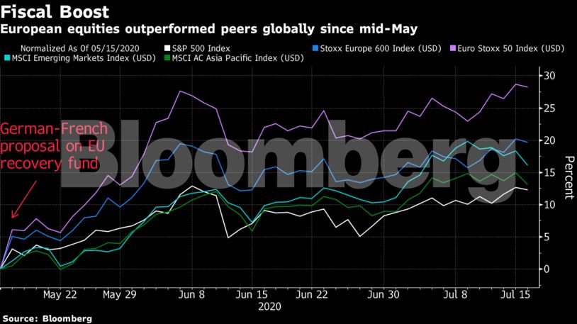 Το ευρώ είναι κοντά στα υψηλά 1,5 έτους, ο γερμανικός DAX σχεδόν διέγραψε τις απώλειες του 2020 και ο Stoxx Europe 600 έχει προσθέσει στη χρηματιστηριακή του αξία 3,5 τρισ. δολάρια από τα χαμηλά του Μαρτίου.