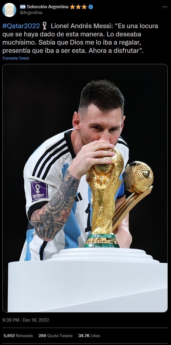 Οι Αργεντίνοι οπαδοί γέμισαν τις πλατείες και τους δρόμους του Μπουένος Άιρες και άλλων πόλεων και χωριών της χώρας για να πανηγυρίσουν τη νίκη μετά από τον τελικό-θρίλερ ενάντια στη Γαλλία στα πέναλτι. Το Παγκόσμιο Κύπελλο αποτελεί, πια, ένα ευχάριστο «διάλειμμα» από τα προβλήματα που αντιμετωπίζουν οι πολίτες καθημερινά. Αποτέλεσε, επίσης, και την τελευταία ευκαιρία για τον καλύτερο παίκτη του κόσμου Λιονέλ Μέσι να «σηκώσει την κούπα», ο οποίος πια παίρνει ισάξια τη θέση του δίπλα στον ποδοσφαιρικό θρύλο Ντιέγκο Μαραντόνα.