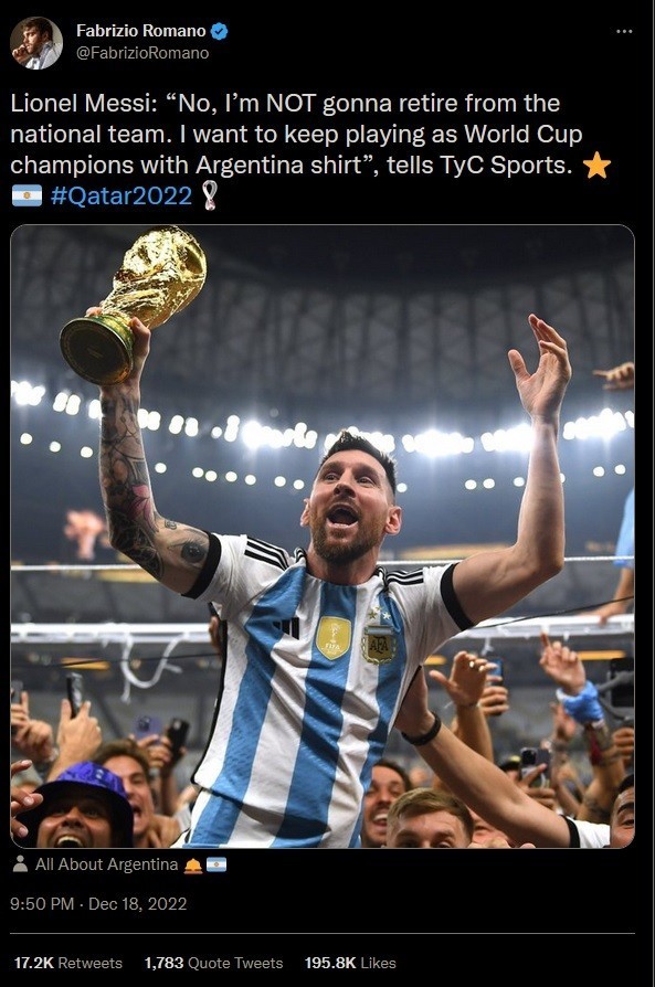 Παρά τον πολιτικό διχασμό που βρίθει στη χώρα, προς το παρόν οι Αργεντίνοι κατέβηκαν μαζί στους δρόμους της πρωτεύουσας, χωρίς έγνοια για το «αύριο». Πανηγύριζαν, τόσο για τη νίκη στο Μουντιάλ αλλά και τη νίκη του «κοντού» Μέσι ο οποίος πια στέκεται «γίγαντας» στο πάνθεον της στρογγυλής θεάς. Όσο για τον διεθνή άσο και MVP της διοργάνωσης, υπογράμμισε πως δεν είναι έτοιμος να αποσυρθεί από την εθνική ομάδα των albiceleste.