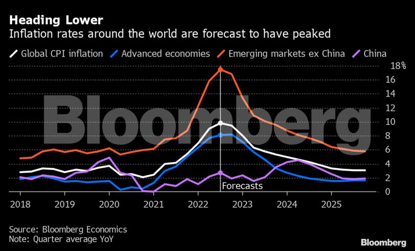 Σύμφωνα με τους υπολογισμούς του Bloomberg Economics, ο ετήσιος παγκόσμιος μέσος όρος του πληθωρισμού κορυφώθηκε στο 9,8% το γ’ τρίμηνο του έτους, ενώ αναμένεται να μειωθεί στο 9,5% το δ’ τρίμηνο του 2022 και στο 5,3% στα τέλη του 2023.