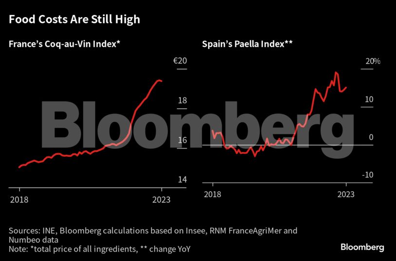 Μπορεί τα γενικά ποσοστά πληθωρισμού να επιβραδύνονται σε όλη την Ευρώπη, αλλά οι τιμές των συστατικών για την παρασκευή παραδοσιακών πιάτων στη Γαλλία και την Ισπανία αναδεικνύουν ότι η χειρότερη κρίση κόστους ζωής εδώ και μια γενιά εξακολουθεί να μαίνεται.