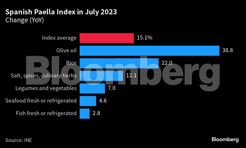 Μια ξεχωριστή μέτρηση του Bloomberg έδειξε ότι η παρασκευή της παέγια, του εθνικού πιάτου της Ισπανίας, ήταν 15,1% ακριβότερη τον Ιούλιο σε σχέση με ένα χρόνο πριν, λόγω της αύξησης του κόστους του ελαιολάδου κατά σχεδόν 40%, σύμφωνα με τα στοιχεία της Εθνικής Στατιστικής Υπηρεσίας.