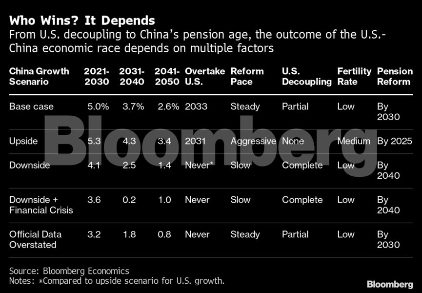 Συγκεντρώνοντας όλα αυτά τα στοιχεία, το Bloomberg Economics έχει δημιουργήσει σενάρια για το αποτέλεσμα του οικονομικού αγώνα ανάμεσα σε ΗΠΑ και Κίνα. Εάν όλα πάνε ακριβώς όπως τα έχει σχεδιάσει η Κίνα και δεν προκύψουν προβλήματα – από τις εσωτερικές μεταρρυθμίσεις έως τις διεθνείς σχέσεις – τότε θα μπορούσε να φτάσει τις ΗΠΑ μέσα στην επόμενη δεκαετία και στη συνέχεια να τις ξεπεράσει.