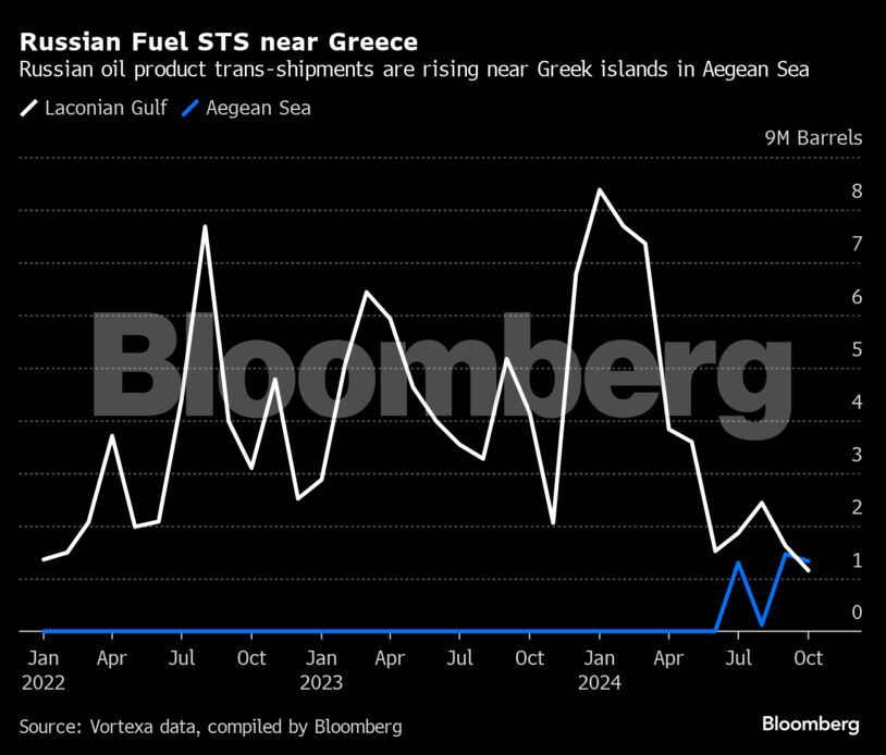 Περίπου 1 εκατομμύριο βαρέλια ντίζελ, μαζούτ και άλλων πετρελαιοειδών το μήνα έχουν μεταφερθεί κοντά σε Λέσβο και Χίο στο Αιγαίο σύμφωνα με στοιχεία της εταιρείας αναλύσεων Vortexa. Η περιοχή έγινε δημοφιλής όταν η Ελλάδα προχώρησε σε ασκήσεις του Πολεμικού Ναυτικού σε μια προσπάθεια να εμποδίσει τη σχετική δραστηριότητα στα ανοικτά της Λακωνίας.