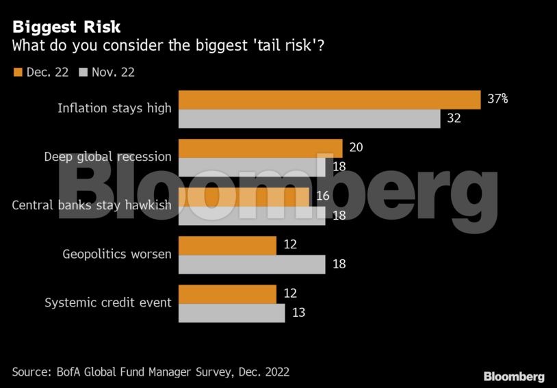 Βάσει των αποτελεσμάτων της δημοσκόπησης της BofA, οι μεγαλύτεροι κίνδυνοι για το 2023 θα είναι ο μόνιμα υψηλός πληθωρισμός και η δημιουργία βαθιάς ύφεσης στην παγκόσμια οικονομία. Οι λοιποί κίνδυνοι συμπεριλαμβάνουν επιθετικές κινήσεις από τις κεντρικές τράπεζες, επιδείνωση των γεωπολιτικών σχέσεων και δημιουργία μίας κρίσης χρέους.