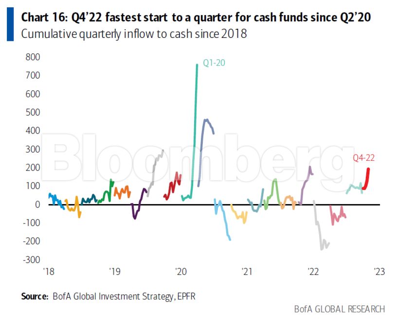 Βάσει των επικαιροποιημένων στοιχείων της EPFR Global, η Bank of America υπογράμμισε πως οι επενδύσεις στον τομέα των μετρητών ανήλθαν στα $62,1 δισ. την περασμένη εβδομάδα, αγγίζοντας συνολικά τα $194 δισ. από τις αρχές Οκτωβρίου.