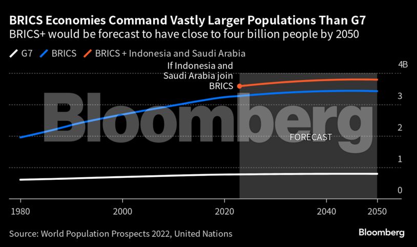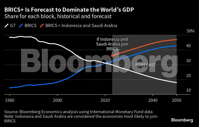 Ένα εκτεταμένο γκρουπ θα αποτελεί περίπου το 50% του παγκόσμιου ΑΕΠ μέχρι το 2040, σύμφωνα με εκτιμήσεις του Bloomberg Economics, υπερδιπλάσιο ποσοστό σε σχέση με αυτό των G7, αλλά και σχεδόν 50% του παγκόσμιου πληθυσμού.