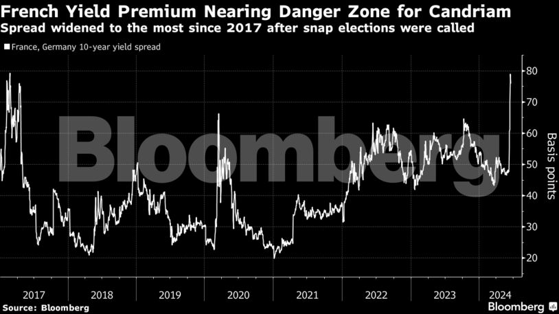 Τα γαλλικά ομόλογα έχουν διολισθήσει από τότε που ο πρόεδρος Εμανουέλ Μακρόν προκήρυξε πρόωρες εκλογές, οδηγώντας το premium της απόδοσής τους έναντι του γερμανικού χρέους στις 79 μονάδες βάσης, το υψηλότερο από το 2017.
