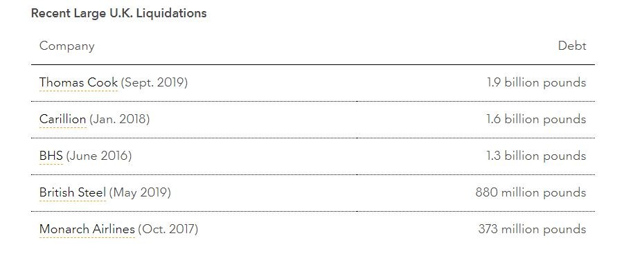 Άλλες περιπτώσεις εταιρειών αντίστοιχου προφίλ είναι η Monarch Airlines που βρέθηκε στην ίδια θέση τον Οκτώβριο του 2017 και πιο πρόσφατα την κατασκευαστική εταιρεία Carillion, η οποία κατέρρευσε το 2018.