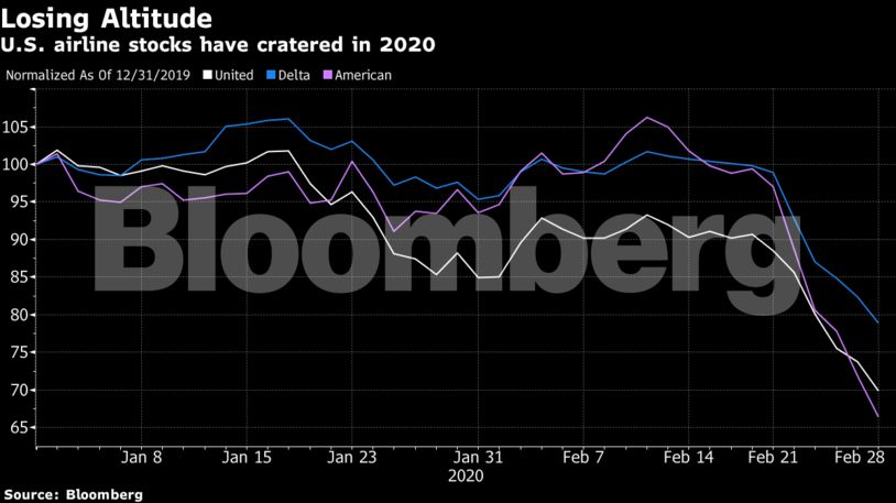 Οι εμπορικές αεροπορικές εταιρείες έχουν υποστεί ισχυρό πλήγμα από την επιδημία. Η American Airlines Group Inc., η United Airlines Holdings Inc. και η Delta Air Lines Inc. έχουν χάσει περίπου το ένα τέταρτο της συνολικής αγοραίας τους αξίας από την αρχή του έτους, με τους αναλυτές να προειδοποιούν ότι η συρρίκνωση τους μπορεί να επιδεινωθεί καθώς η επιδήμια περιορίζει τη ζήτηση για ταξίδια.