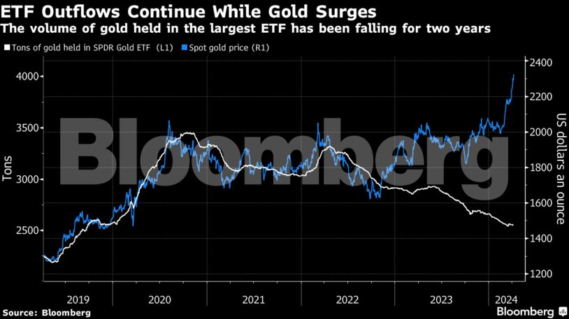 Η άντληση κερδών από μακροπρόθεσμους επενδυτές που αγόρασαν πριν από χρόνια είναι ο τρόπος με τον οποίο η Citigroup Inc. εξηγεί γιατί οι καθαρές εισροές των ETF ήταν αξιοσημείωτα αδύναμες. Το γεγονός ότι οι σταθερές και σημαντικές εκροές δεν είχαν μεγαλύτερο αντίκτυπο στις τιμές υποδηλώνει επίσης ισχυρή ζήτηση για τις ράβδους, με τις κεντρικές τράπεζες να είναι ένας λογικός αγοραστής, σύμφωνα με τον Τζο Καβατόνι, ο οποίος επιβλέπει την πλατφόρμα ETF του Παγκόσμιου Συμβουλίου Χρυσού (WGC).