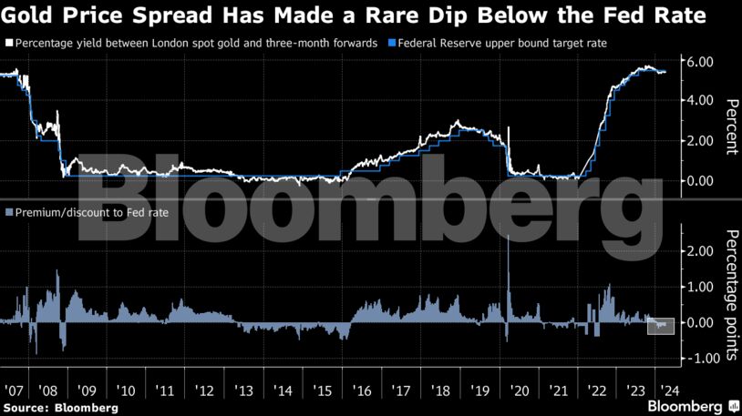 Η ποσοστιαία απόδοση μεταξύ των τιμών spot στο Λονδίνο και των προθεσμιακών συμβολαίων τριμήνου, η οποία τείνει να ακολουθεί τα επιτόκια λόγω του κόστους αποθήκευσης, χρηματοδότησης και ασφάλισης του χρυσού, κατέγραψε μια σπάνια πτώση υπό τα επιτόκια της Fed τις τελευταίες εβδομάδες, καθώς οι τιμές spot ανέβηκαν στα ύψη. Ιστορικά, αυτό συμβαίνει σε μόνιμη βάση μόνο όταν τα επιτόκια είναι είτε χαμηλά είτε πρόκειται να κινηθούν απότομα χαμηλότερα.