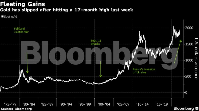 Από τον πόλεμο των Falklands το 1982 μέχρι την επίθεση στους Δίδυμους Πύργους το 2001, τα ράλι του χρυσού που συμπεριλαμβάνουν στρατιωτική παρέμβαση είναι βραχυπρόθεσμα, σύμφωνα με αναλυτές της Citigroup. Σημειωτέον πως το κλασικό safe haven asset κατέγραψε ράλι του 3,4% στις 24 Φεβρουαρίου μετά την εισβολή στην Ουκρανία. Οι τιμές, από τότε, έχουν καταγράψει διόρθωση, παρά τα συνεχιζόμενα ράλι του αλουμινίου, του πετρελαίου και των σιτηρών.