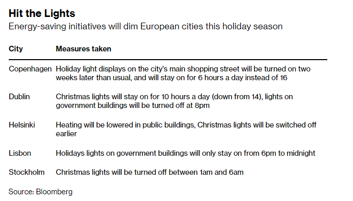 Με την προοπτική του μπλακ άουτ και του δελτίου να έρχεται όλο και πιο κοντά, αξιωματούχοι σε πόλεις όπως το Ελσίνκι, η Λισαβόνα και το Λονδίνο τραβούν την πρίζα στον διακοσμητικό φωτισμό σε κεντρικούς δρόμους και πλατείες. Η εισβολή της Ρωσίας στην Ουκρανία έχει πλήξει τις σχέσεις με τον σημαντικότερο προμηθευτή ενέργειας της ευρωπαϊκής ηπείρου και οι κάτοικοι καλούνται να μειώσουν την κατανάλωση θέρμανσης και ηλεκτρικού ρεύματος. Τα λιγότερα φώτα στη διάρκεια της εορταστικής περιόδου είναι μέρος αυτής της προσπάθειας.
