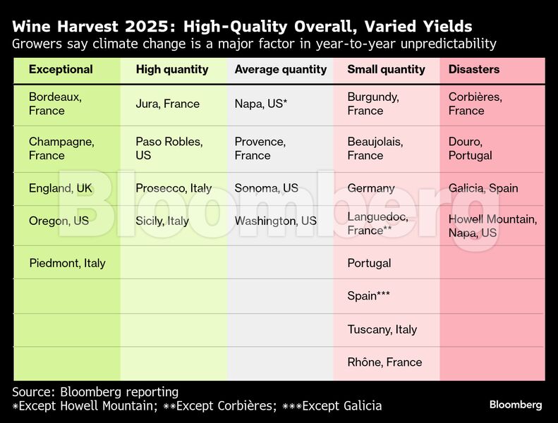 Η συγκομιδή του 2025 χαρακτηρίστηκε από ρεκόρ πρόωρης έναρξης. Στην Αλσατία, οι εργάτες μπήκαν στα αμπέλια στις 19 Αυγούστου, στη Σαμπάνια, στις 20, για τις λευκές ποικιλίες του Ροδανού, στα μέσα Αυγούστου, δύο ολόκληρες εβδομάδες νωρίτερα από πέρυσι. Στη περιοχή Rheingau της Γερμανίας, τα πρώτα σταφύλια μαζεύτηκαν στα τέλη Αυγούστου, τρεις εβδομάδες νωρίτερα από τον μακροχρόνιο μέσο όρο.