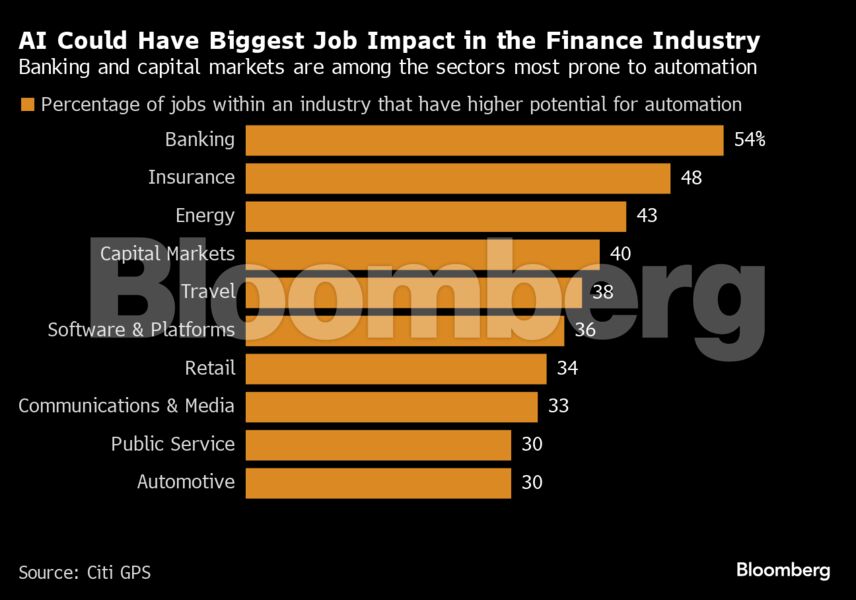 Περίπου το 54% των θέσεων εργασίας σε όλο τον τραπεζικό τομέα έχουν μεγάλη πιθανότητα να αυτοματοποιηθούν, ανέφερε η τράπεζα την Τετάρτη σε νέα έκθεση για την τεχνητή νοημοσύνη. Ένα επιπλέον 12% των ρόλων σε ολόκληρο τον κλάδο θα μπορούσε να ενισχυθεί με την τεχνολογία, διαπίστωσε η Citigroup.