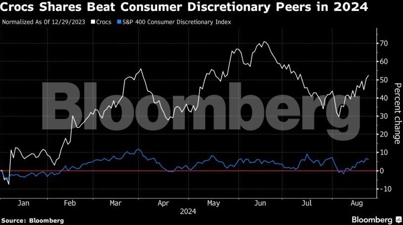 Με τη σημερινή άνοδο της η μετοχή της Crocs μετρά σημαντικά κέρδη της τάξεως του 52% για τη χρονιά, με αποτέλεσμα να είναι από τις πιο επιτυχημένες του δείκτη S&P 400 Consumer Discretionary Index.