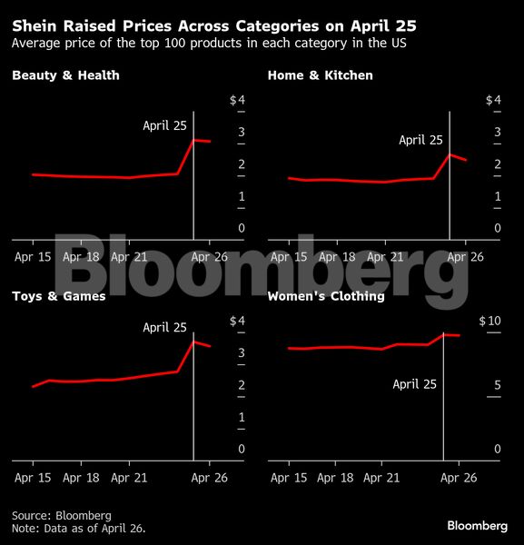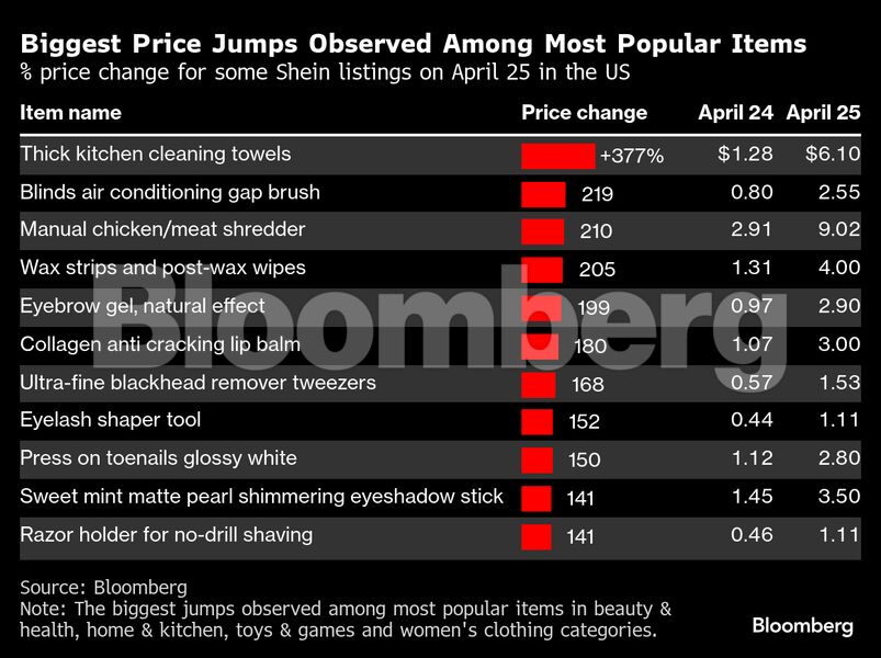 Σε γενικές γραμμές, οι τιμές αυξήθηκαν κατά περίπου 10% για τη Shein στις ΗΠΑ από τις 24 έως τις 26 Απριλίου με βάση ένα δείγμα καλαθιού αγορών που συμπλήρωσε το Bloomberg News με 50 αντικείμενα από διάφορες κατηγορίες. Κατά τη διάρκεια αυτής της περιόδου, 7 από τα 50 είδη του δείγματος διαγράφηκαν από την λίστα στις ΗΠΑ. Αντίθετα, οι τιμές της Shein στο Ηνωμένο Βασίλειο παρέμειναν ως επί το πλείστον αμετάβλητες και κανένα είδος δεν αποσύρθηκε από την λίστα.