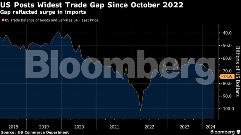 Το έλλειμμα του εμπορικού ισοζυγίου των ΗΠΑ διευρύνθηκε τον Απρίλιο στο μεγαλύτερο από τον Οκτώβριο του 2022 λόγω της αύξησης των εισαγωγών αγαθών, συμπεριλαμβανομένων των μηχανοκίνητων οχημάτων, των ηλεκτρονικών υπολογιστών και των βιομηχανικών προμηθειών.