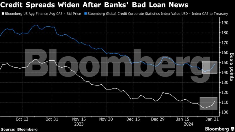 Τα παγκόσμια πιστωτικά spreads οδεύουν προς τη μεγαλύτερη εβδομαδιαία αύξηση των τελευταίων τεσσάρων μηνών, καθώς οι αυξανόμενες πιέσεις στην αγορά ακινήτων ωθούν τις τράπεζες σε αναθεώρηση και αύξηση των προβλέψεών τους όσον αφορά τα επισφαλή δάνεια.