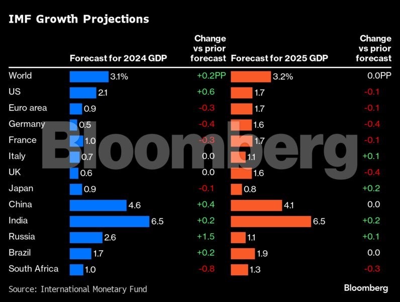 Σύμφωνα με τις προβλέψεις του Ταμείου η παγκόσμια οικονομία θα αναπτυχθεί κατά 3,1% το 2024, έναντι της προηγούμενης πρόβλεψης για ανάπτυξη κατά 2,9% ενώ διατήρησε αμετάβλητη την πρόβλεψή του για το 2025 στο 3,2%.