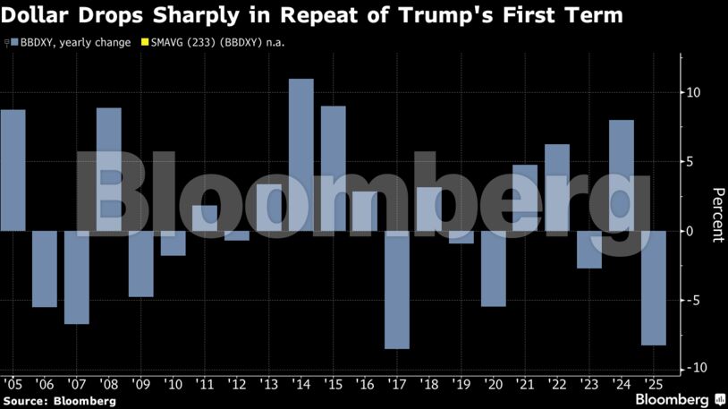 Ο δείκτης Bloomberg Dollar Spot υποχώρησε κατά 0,3% την Τρίτη, αγγίζοντας το χαμηλότερο επίπεδο από τις 3 Οκτωβρίου. Σε ετήσια βάση χάνει 8,2%, επίδοση που, αν επιβεβαιωθεί, θα αποτελεί τη μεγαλύτερη πτώση από το 2017. Μία ακόμη περιορισμένη υποχώρηση θα οδηγούσε το αμερικανικό νόμισμα στη χειρότερη χρονιά του εδώ και τουλάχιστον δύο δεκαετίες.