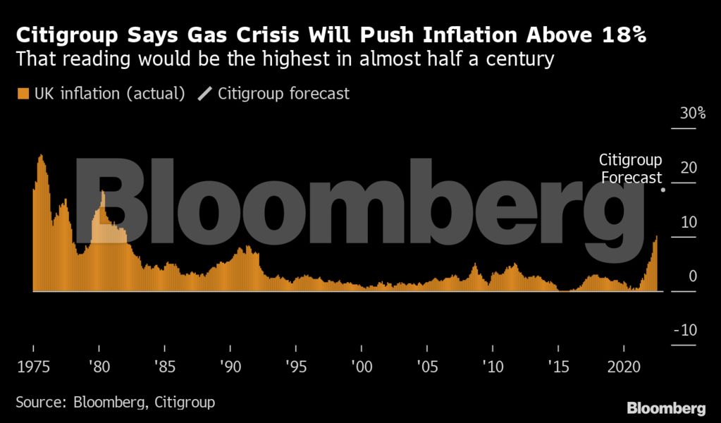 Χρησιμοποιώντας προβλέψεις για το ανώτατο όριο της λιανικής τιμής στην ενέργεια το οποίο οι αναλυτές αναμένουν να αυξηθεί κοντά στις 6.000 £ τον Απρίλιο από 1.971 £ που βρίσκεται σήμερα, ο Βρετανός οικονομολόγος της Citi, Μπέντζαμιν Ναμπάρο ανέφερε σε σημείωμά του ότι η αύξηση του δείκτη τιμών καταναλωτή θα κορυφωθεί στο 18,6% τον Ιανουάριο.